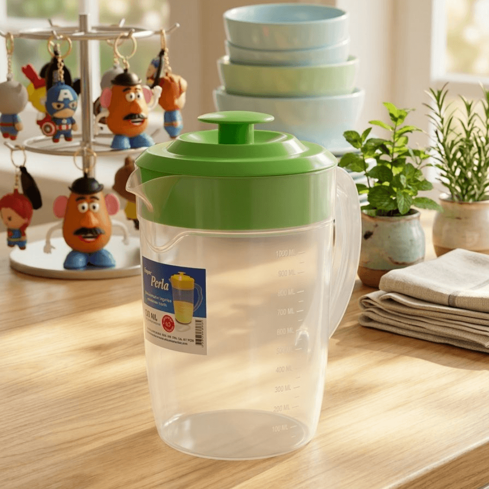 Dale vida a tu mesa con la jarra Perla. Con una capacidad ideal de 1,3 litros, es perfecta para el uso diario o para espacios compactos. Su diseño traslúcido con medidor te permite ver el contenido, mientras que su tapa disponible en varios colores vibrantes (como el verde de la imagen) le da un toque alegre a tu cocina. ¡Ligera, práctica y fácil de lavar!